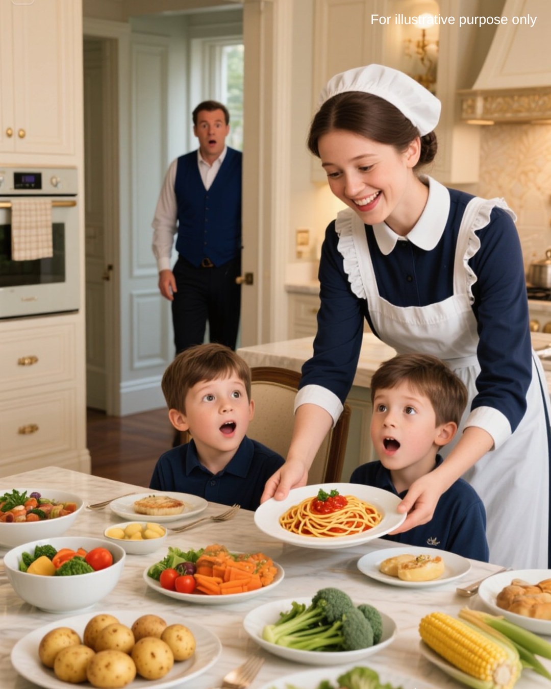 Rijst, geroosterde kip en warme soep. De geur was goed, maar de kinderen keken er niet eens naar. Mariana ging naast hen zitten en keek naar hun elke beweging. Ricardo keek een seconde op. “Je mag eten als je wilt. Het hoeft niet,” zei hij. Toen keek hij weer naar zijn telefoon. Mariana leunde iets dichter naar Sofia. “Wil je dat ik je help met de kip?” Het meisje schudde haar hoofd.