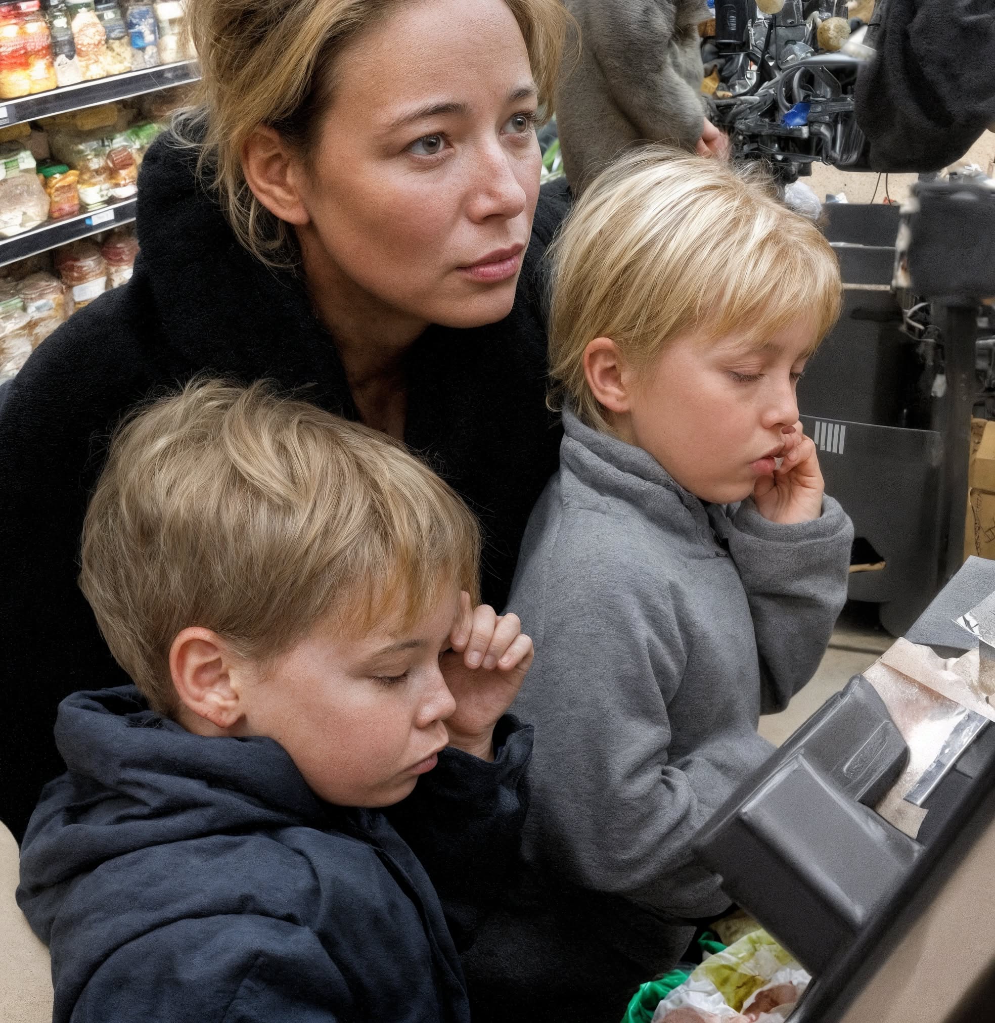 Tegen tien uur stond een vrouw in mijn kassa rij. Ze leek ongeveer van mijn leeftijd, misschien iets jonger. Licht jack, vermoeide ogen. Bij haar waren twee kinderen. Een jongetje, drie of vier jaar oud, dat haar hand vasthield en in zijn ogen wreef. De andere was een meisje, iets ouder, dat de appels in het wagentje aanstaarde alsof het goud was. Er was iets in haar houding – stijf en stil – dat me vertelde dat ze zich inhield om niet in te storten.